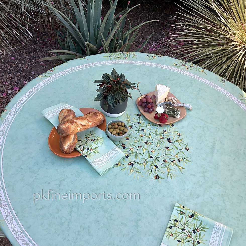 PK Fine Imports is pleased to offer a full collection of beautiful round French coated coated tablecloths from Provence. These colorful Provencal tablecloths are made from 100% cotton with a non-toxic acrylic coating applied to make them stain resistant. Softer and more durable than a vinyl tablecloth, our coated round French tablecloths are easily cleaned by just wiping them down with a damp cloth. They are wonderful for outdoor use on your patio or deck to to take along for a picnic. Available in 60", 70" and 90" round sizes.